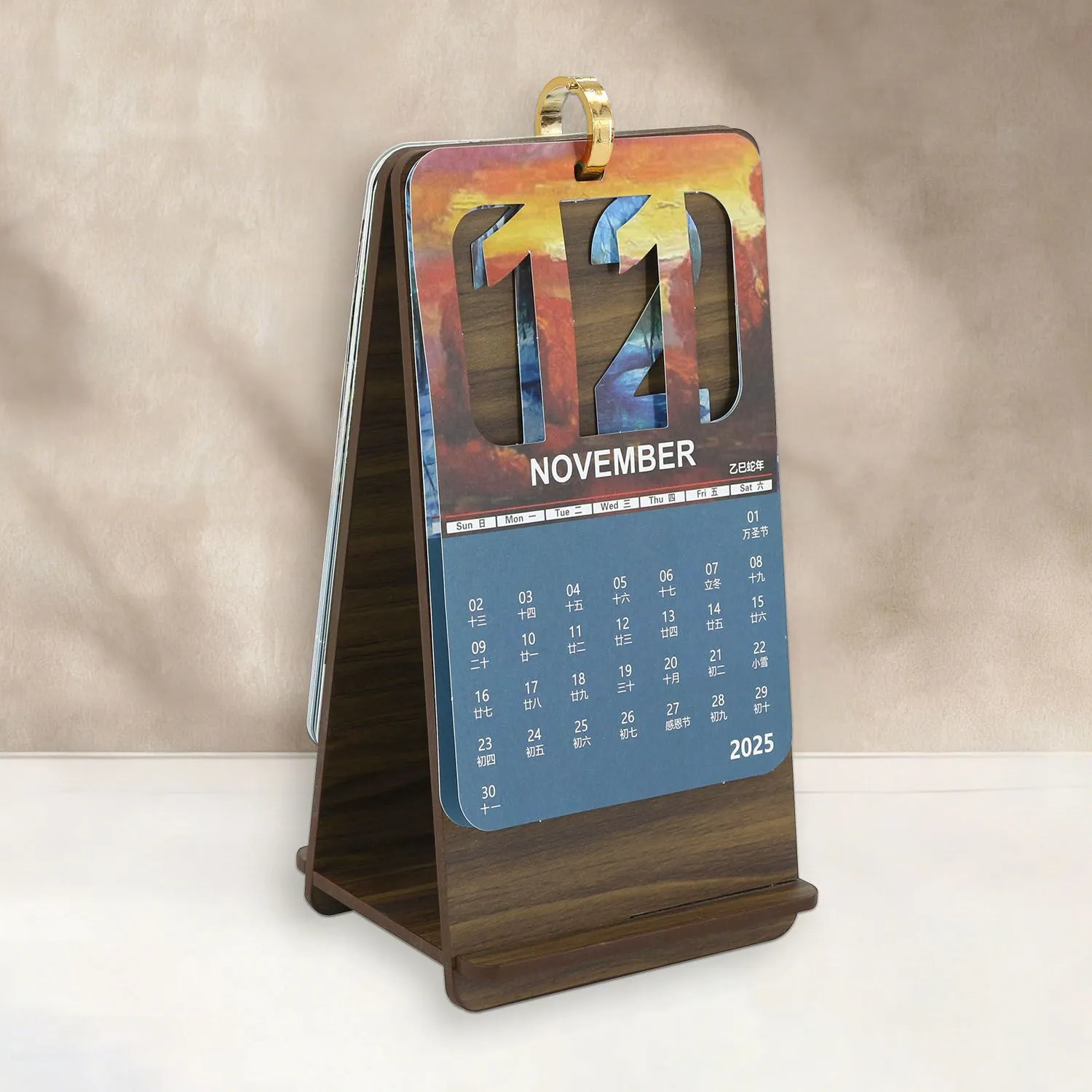 One of the standout elements of our desk calendars is the sturdy triangular stand, designed to keep the calendar stable and perfectly displayed on any tabletop. The frame is constructed from durable 2–3 mm grey board, wrapped in 157 gsm coated paper with matte or glossy lamination for added protection and visual appeal, with an inner lining of 80–120 gsm uncoated paper for a clean, refined finish.
