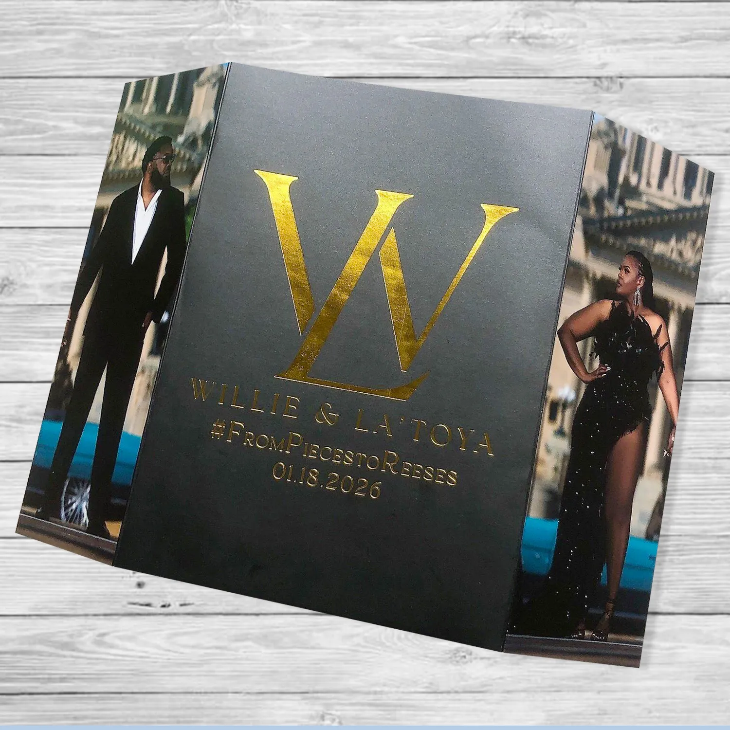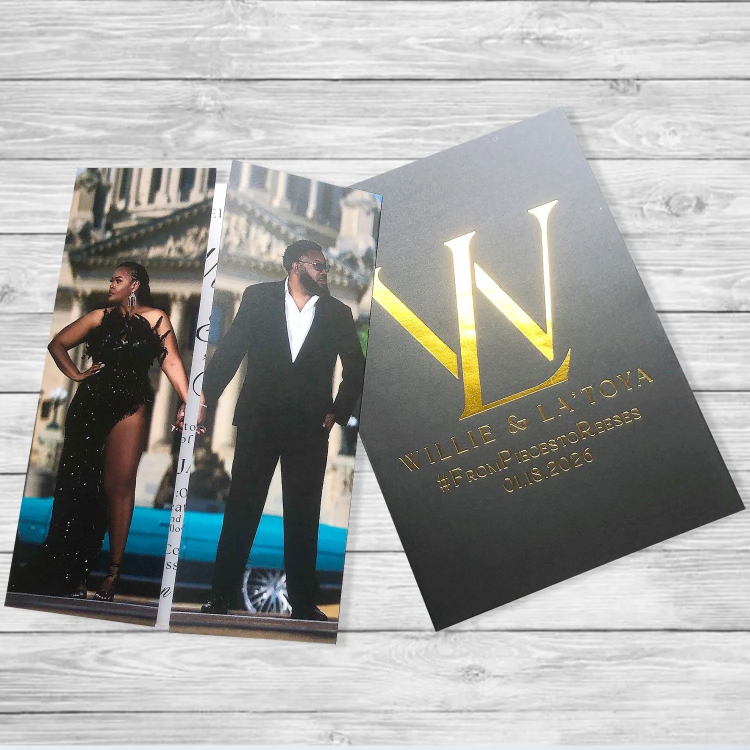 Specialty finishes elevate invitations by adding texture, shine, and a premium feel. Options you can choose from include foil stamping, spot UV, embossing, holographic effects, and die cutting.