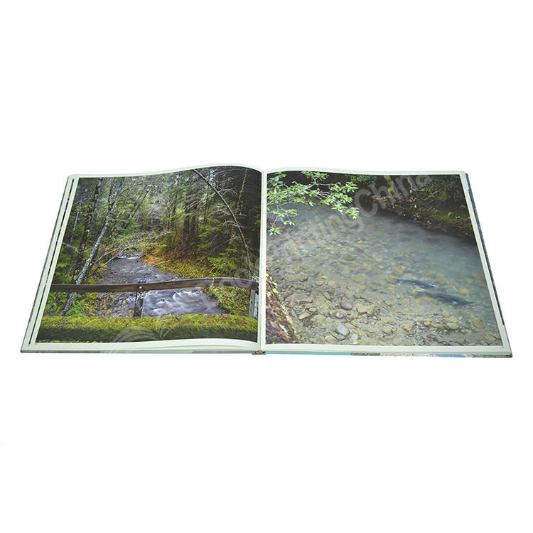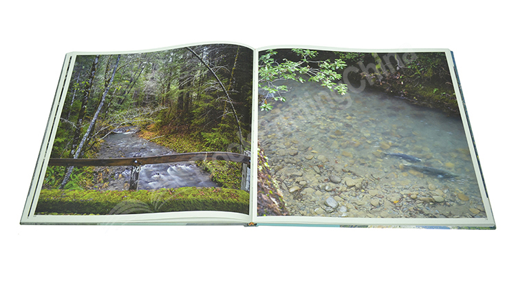 When you touch the cover you can feel the embossed logo, the book size is big, and the embossed LOGO is big too.  Open the book you can see the very beautiful printed photos.  For similar photo book usually use the coated art paper, you can choose the gloss finish paper or the matt finish paper in different weight perferences.  In our factory you can choose from 80gsm/105gsm/128gsm/157gsm/200gsn for inner pages for hardcover book version.