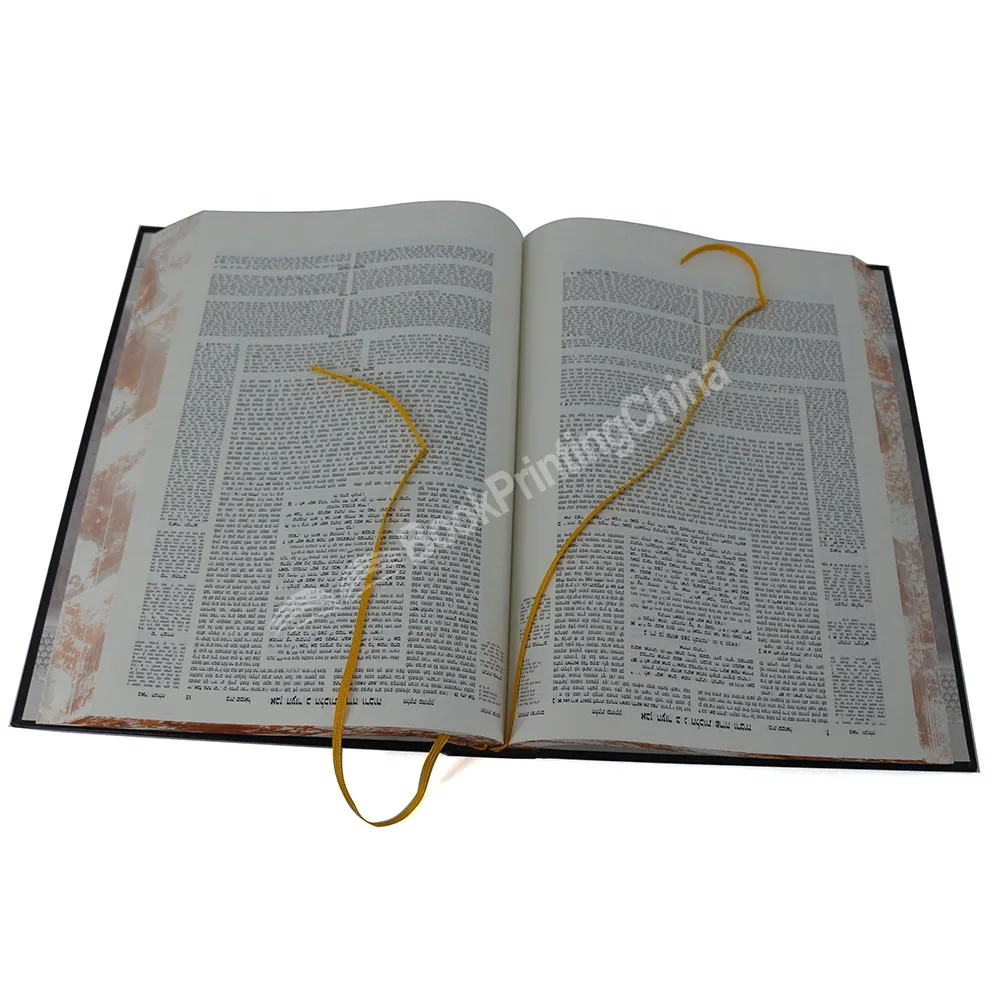This oversized religious book features a faux leather hardcover cover is accented with a heat debossed frame that is embellished with intricate graphic design. The gold foiled title and logo is displayed within the frame. Edges printing add extra luster to the overall design. Durable hardcover binding allows the pages open completely flat without damaging the spine, and two ribbon bookmarks offer an easy way to navigate and mark your religious book. The text is printed on creamy Munken paper, which is lightweight and comfortable to read.