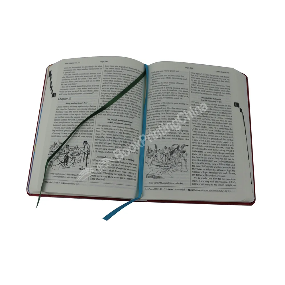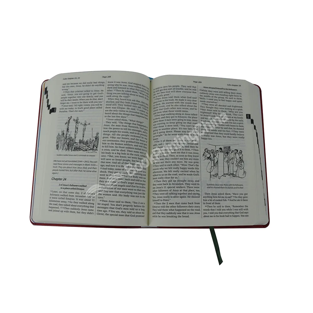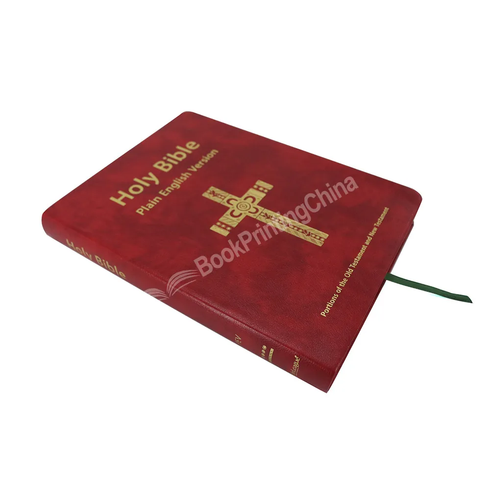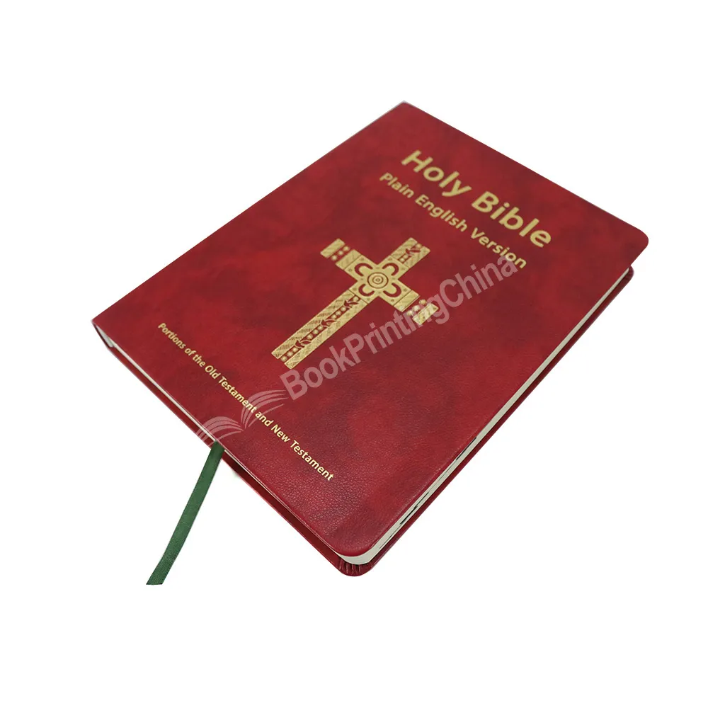 The faux leather bible Holy Bible Plain English Version with two ribbon bookmarks allow readers to remember a location in the text when looking up a cross-reference, or to mark a specific passage to which they will return. The spine and cover features gold foil stamping, making the bible looks more luxury. Whether for standard size or custom size bible printing, at BookPrintingChina, we can ensure your bible is printed in professional look.
