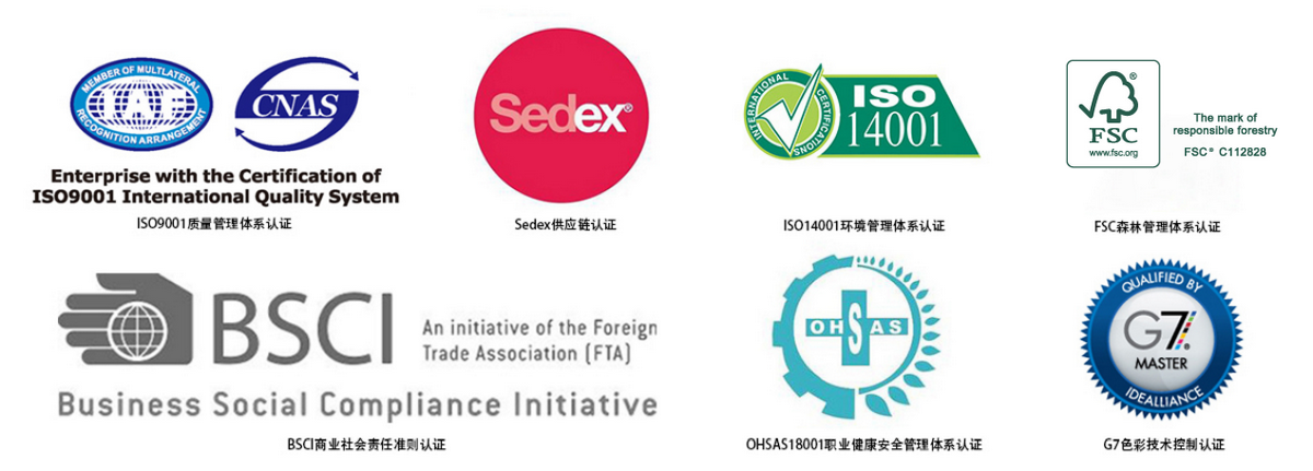 With the fierce market environment, in view of the growing scale, in order to adapt to the changes of the international environment. BookPrintingChina has successfully imported ISO 9001:2008/QMS quality management system certification, “ISO 14001:2004/EMS” environmental management system certification, “OHSAS 18001:2007” occupational health management system certification, “FSC-COC” forest management system certification and “ETI-Smeta” social responsibility management system certification, “G7” color technology control certification, “BSCI” commercial social responsibility standards recognition.